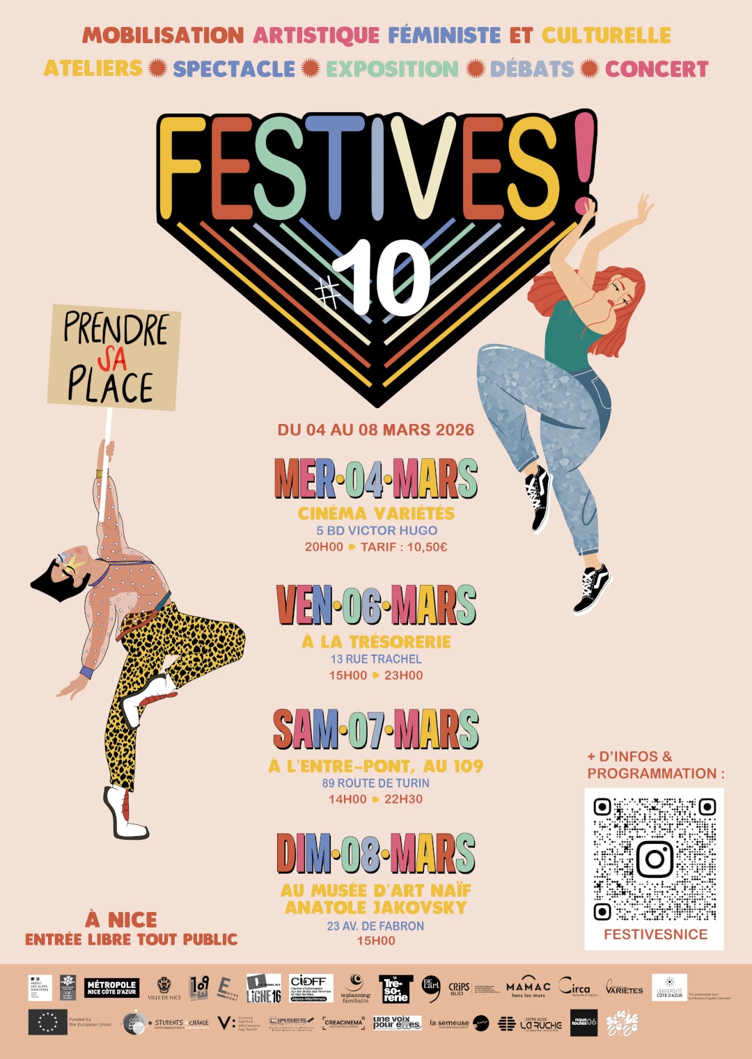 La 10ème édition de Festives ! se déroulera du mercredi 4 mars au dimanche 8 mars. Le samedi 7 mars, le festival s’installera à l’Entre-Pont pour une kermesse à ciel ouvert qui détournera les classiques du genre, en présence d’associations (CIDFF06, CRIPS Sud, Noustoutes06 Planning familial 06, Une voix pour elles) et de plusieurs artistes (Djulay La papaye, Olalarte) qui se clôturera par un karaoké féministe pour clôturer la journée et revoir ses classiques pour prendre sa place !